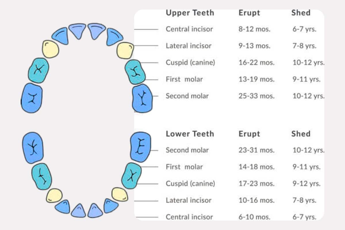 Teeth normally erupt in groups, though one tooth may appear a few days or weeks ahead of the others. The average timeline for eruption is: